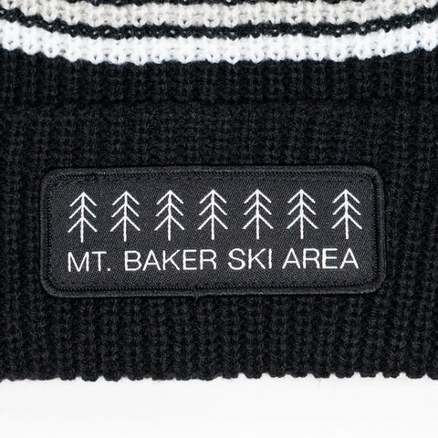 Our Seven Trees beanie redone in a new striped version! Mt. Baker Ski Area is notable for an abundance snowfall leading to heavily snow laden trees. The woven patch with merrowed edge evokes the simple pleasure of riding among these classic features.